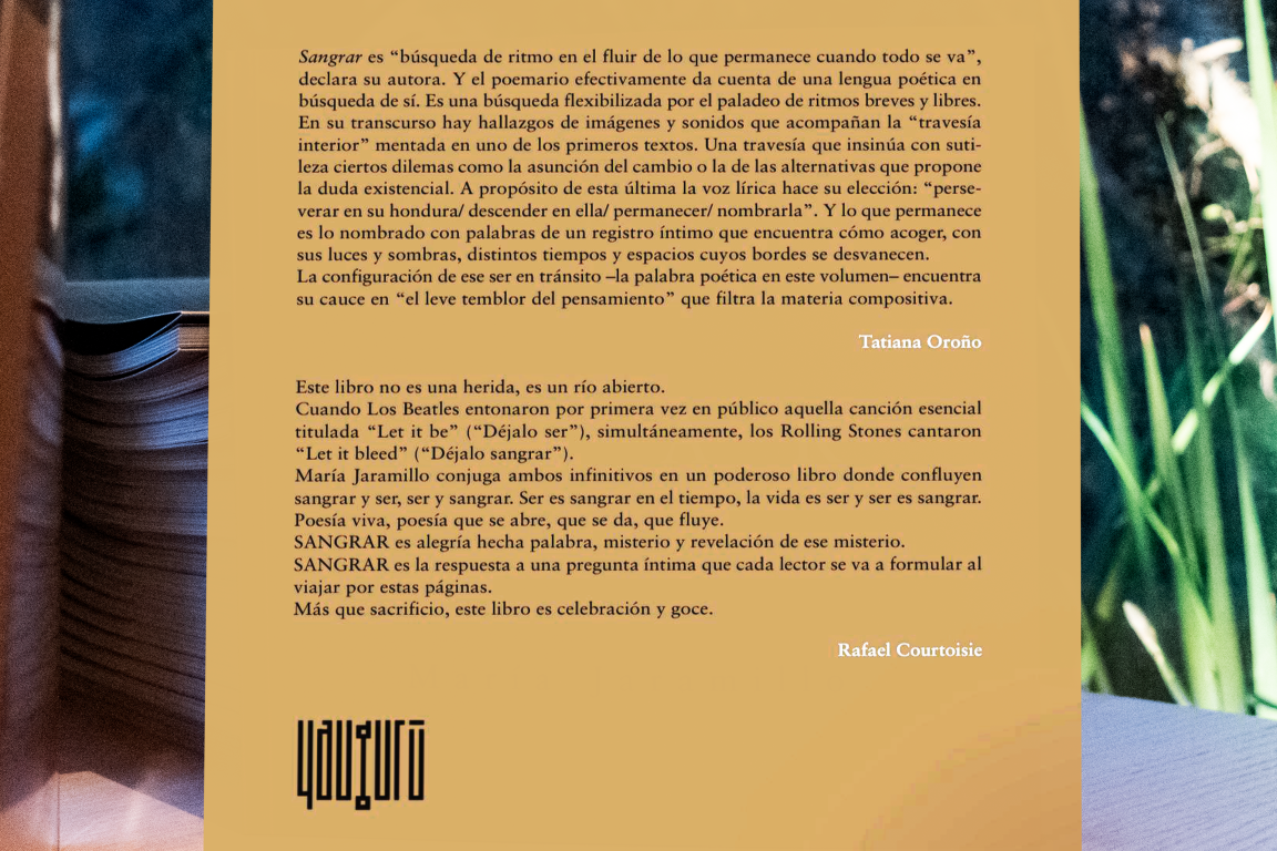 Sangrar, editado por Yaugurú en Uruguay, se mueve entre la memoria, el desarraigo, la transformación y la herida como territorio de expansión. Aquí la vulnerabilidad no cae: avanza. Reconoce el dolor, pero al mismo tiempo la fuerza luminosa que puede brotar de el. La sangre, más que ruptura, aparece como metáfora de continuidad, de un cuerpo y una voz que elige seguir.