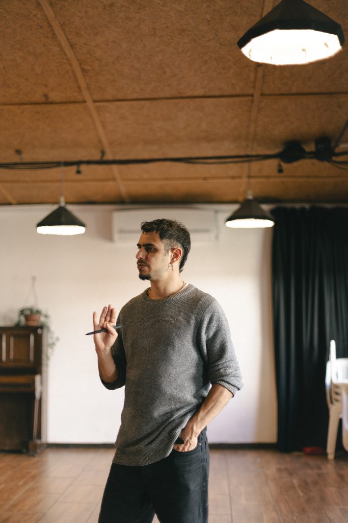 Escribí hace muchos años un ensayo sobre la actuación en el espacio y jamás lo publiqué ni lo compartí. Un error que juega en contra de ese mito vanguardista. Allí lograba imaginarme una pandemia antes de que existiera. Me daba cuenta de que el espacio era lo único imprescindible para el arte del teatro, incluso mucho antes de saber qué rol vamos a ocupar en él. El cine no se hace sin el punto de vista de la cámara. El teatro no se hace sin el acontecimiento en el espacio. El lenguaje del cine depende de ese aparato tecnológico para actuar. Lo mismo el teatro con el espacio. El espacio es el cuerpo mayor. El cuerpo a llenar. El actor es el cuerpo menor. La teatralidad  surge de estas dos tensiones corporales, que serán atravesadas por luz, sonido y palabra. El teatro nace cuando una persona se dispone a mirar (como parafrasea Kartun a Spinoza), “lo que puede un cuerpo” en un espacio.